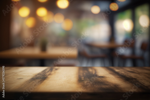 Wooden table in front of abstract blurred coffee shop background. Created with Generative AI Technology