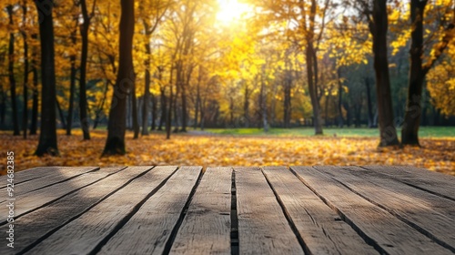 Wooden table on the background of the autumn park. The generation of AI