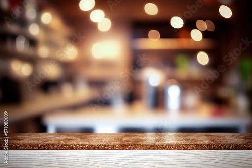 Wooden Table Side view, Restaurant Decor, product placement, bokeh lights, selective focus