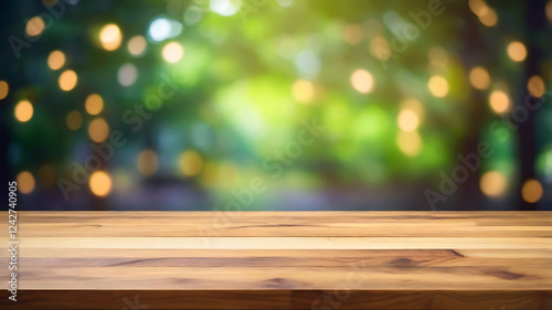 Wooden table top with a blurred bokeh background. Perfect for display, product placement, or advertising
