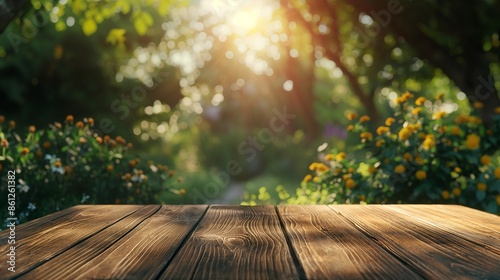 Wooden table with a blurred green nature garden background, creating a serene and natural setting.