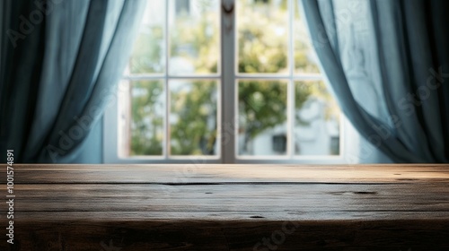 Wooden table with blurred background of window framed by curtains and trees outside the window