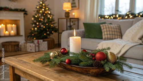 Wooden table with Christmas decorations, including a candle, evergreen branches, and ornaments, in a cozy living room setting, festive, wooden table