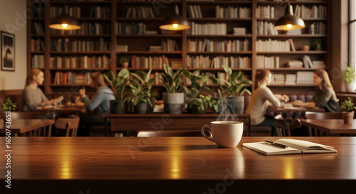 Wooden table with coffee cup and notebook, blurred background showing cafe interior with bookshelves and people