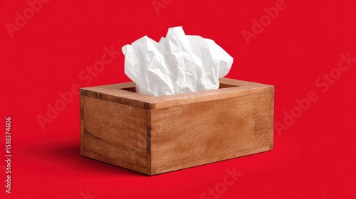 Wooden Tissue Box with White Tissues on Red Background Minimalist Design