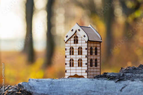 Wooden toy house on forest and river background_