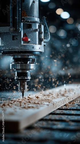 Woodworking process using a CNC machine in a workshop creating precise cuts during late evening hours