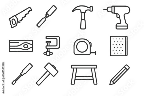 Woodworking Tools Icons. Outline icon set of DIY woodworking: saw, chisel, hammer, drill, wood plank, clamp,
