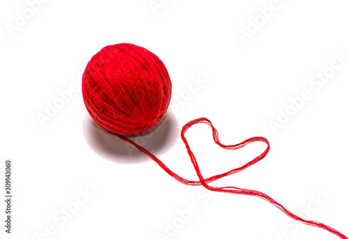 wool skein red thread in the shape of heart on white background