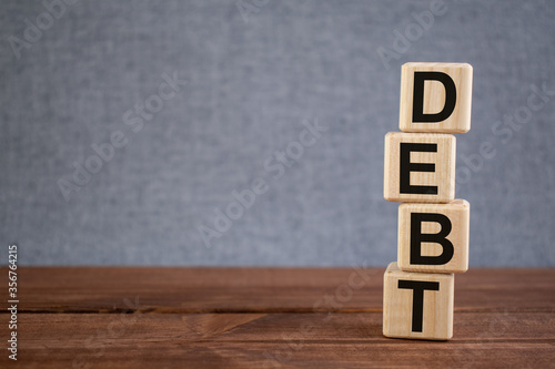 Word DEBT text on wooden cubes on dark wooden backround. Business, Marketing, Growth concept.