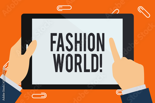 Word writing text Fashion World. Business photo showcasing world that involves styles of clothing and appearance Businessman Hand Holding, Pointing and Touching Colorful Tablet Blank Screen