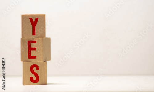 Word YES is made of wooden building blocks lying on the table and on a light yellow background.