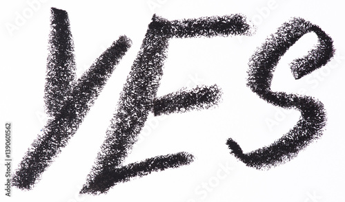 Word YES written in large, textured black crayon letters on a white background. The crayon marks are thick and slightly uneven