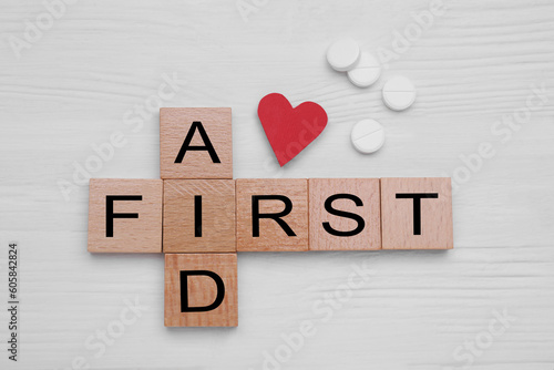 Words First Aid made of cubes, cardboard heart and pills on white wooden table, flat lay