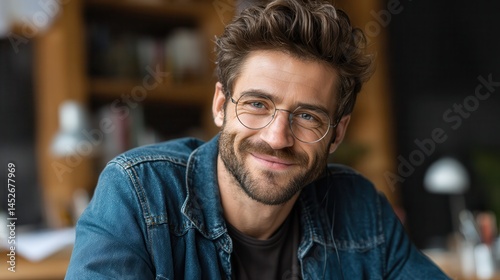 Work from home video call meeting Smiling man with glasses in a casual setting.