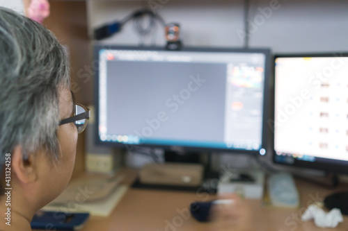 Work from Home WFH Via Online networkTechnology prevent pandemic contagious quarantine covid-19 Concept: Middle-aged Woman Senior Professional Programmer working data on screen desktop computer