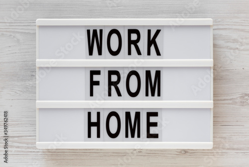 'Work from Home' words on a lightbox on a white wooden background, top view. Overhead, from above, flat lay.