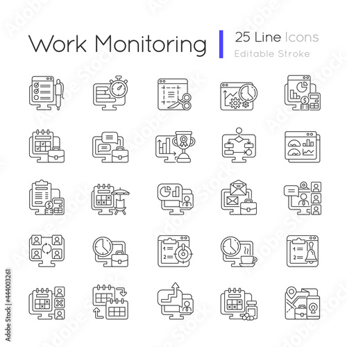 Work monitoring linear icons set. Employee performance control. Productivity for collaborative tasks. Customizable thin line contour symbols. Isolated vector outline illustrations. Editable stroke