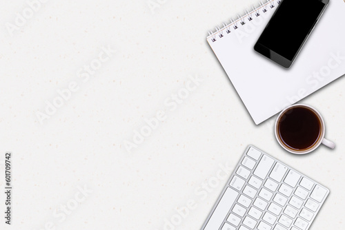 Work office desk with keyboard, coffee, notepad and a smart phone
