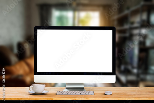 Work place concept : Mock up Blank screen computer desktop with keyboard in cafe or co-working background.