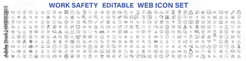 Work Safety editable stroke outline web icons set. Safety first, hazard, protection, health, insurance, regulations, helmet and work. Vector illustration