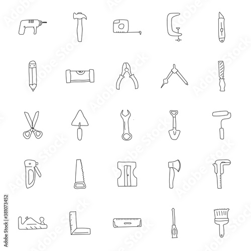 work tools hand drawn linear doodles isolated on white background. work tools icon set for web and ui design, mobile apps and print products