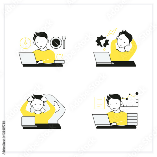 Workaholic flat icons set. Workaholism prevention, consequences. Depersonalization, counterproductive behaviour, skip breaks.Overworking concept.Vector illustrations