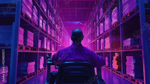 Worker driving forklift on shelves in large warehouse, back view animation Triadic Color Scheme
