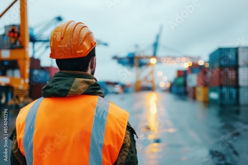 worker in a high-visibility orange vest and hard hat stands with his back to the camera, overlooking a busy container port