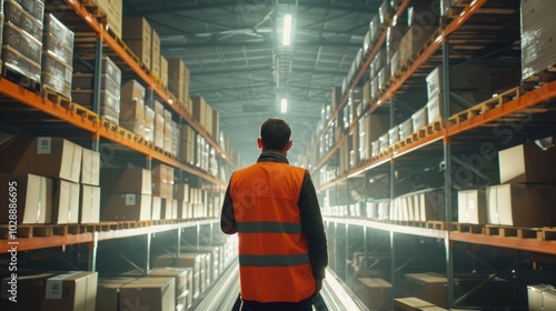 Worker in a high-visibility vest scans boxes on a conveyor surrounded by towering shelves under cool fluorescent lights