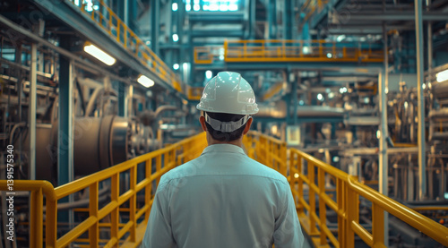 worker in hard hat stands in industrial facility, observing machinery and equipment. environment is filled with pipes and structures, showcasing complex industrial setting