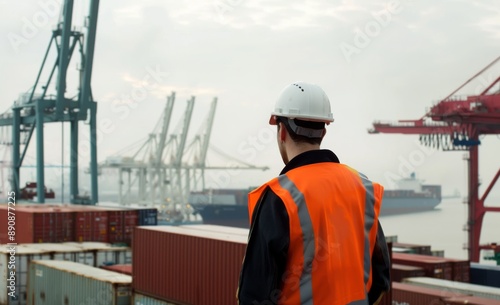 Worker in high-visibility vest and helmet overlooking shipping containers and cranes at a port. Industrial logistics and transportation concept.