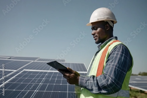 Worker in high-visibility vest examining solar panel setup at renewable energy site. Focus on inspecting technology for efficient energy conversion