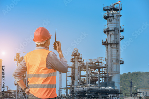 Worker in Oil Refinery discussion and control operation inspection by hand holding walkie-talkie and wearing hat safety helmet and power plant with refinery plant structure background.