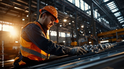 Worker in Safety Gear Operating Machinery in Industrial Setting During Sunset with Warm Light Filtering Through Factory Windows