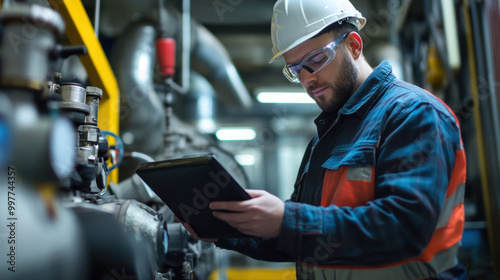 worker in safety helmet and goggles is using tablet to monitor equipment in industrial setting, showcasing importance of predictive maintenance tools