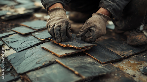 Worker Installing Slate Tiles