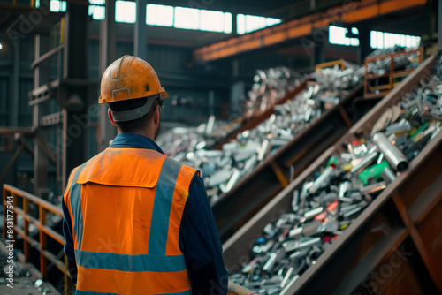 Worker sorting recyclable plastic bottles at a recycling facility. Generative AI