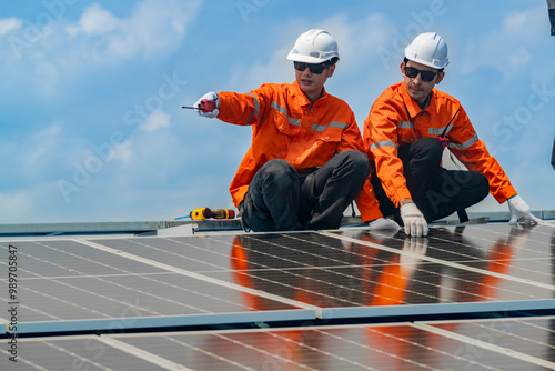 Worker Technicians are working to construct solar panels system on roof. Installing solar photovoltaic panel system. Men technicians walking on roof structure to check photovoltaic solar modules.