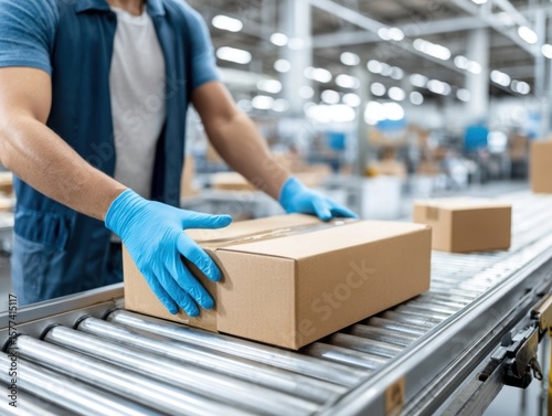 Worker wearing gloves places cardboard box on conveyor, in distribution warehouse or factory setting.
