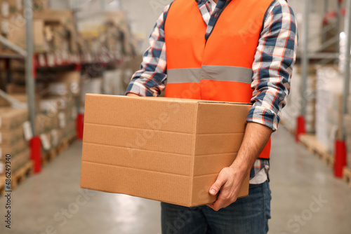 Worker with cardboard box in warehouse, closeup. Wholesaling