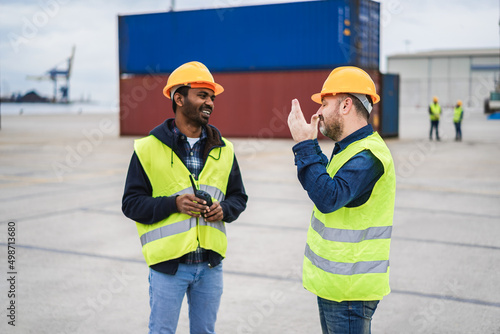 Workers controlling shipping containers at industrial port outdoor - Focus on right man hand