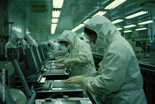 Workers in a modern factory environment using computers for their tasks, possibly in a manufacturing or production setting