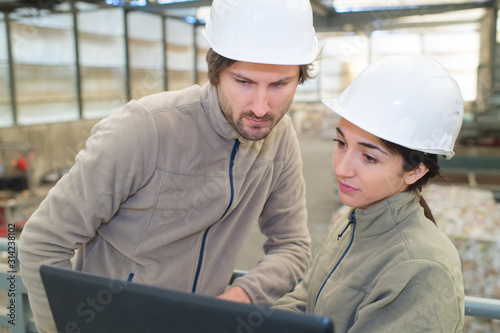 workers in a recycle center looking at laptop