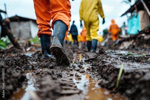Workers in bright protective gear crossing a muddy, debris-strewn terrain following a disaster, embodying the spirit of resilience and commitment as they engage in the post-disaster cleanup efforts.