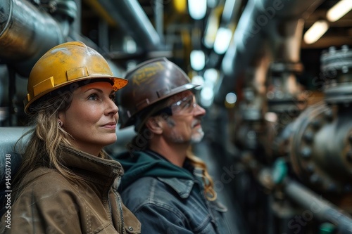 Workers in hard hats observing machinery operations in an industrial facility during the day shift
