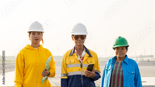 Workers in Safety Gear Pose Confidently at Construction Site During Daylight Hours in a Bustling Area