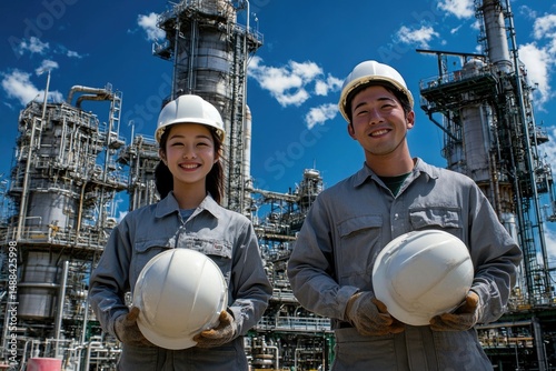 Workers in safety gear pose for a photograph at an industrial facility in Japan, highlighting teamwork and dedication in the energy sector