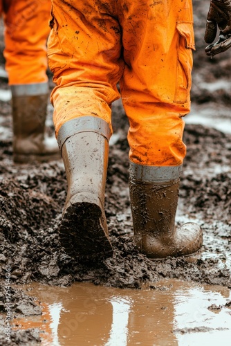 Workers Navigating Muddy Construction Site with Perfect Balance in High Fidelity Image