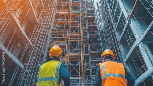 Workers observe modern building structure at a construction site, safety gear included.